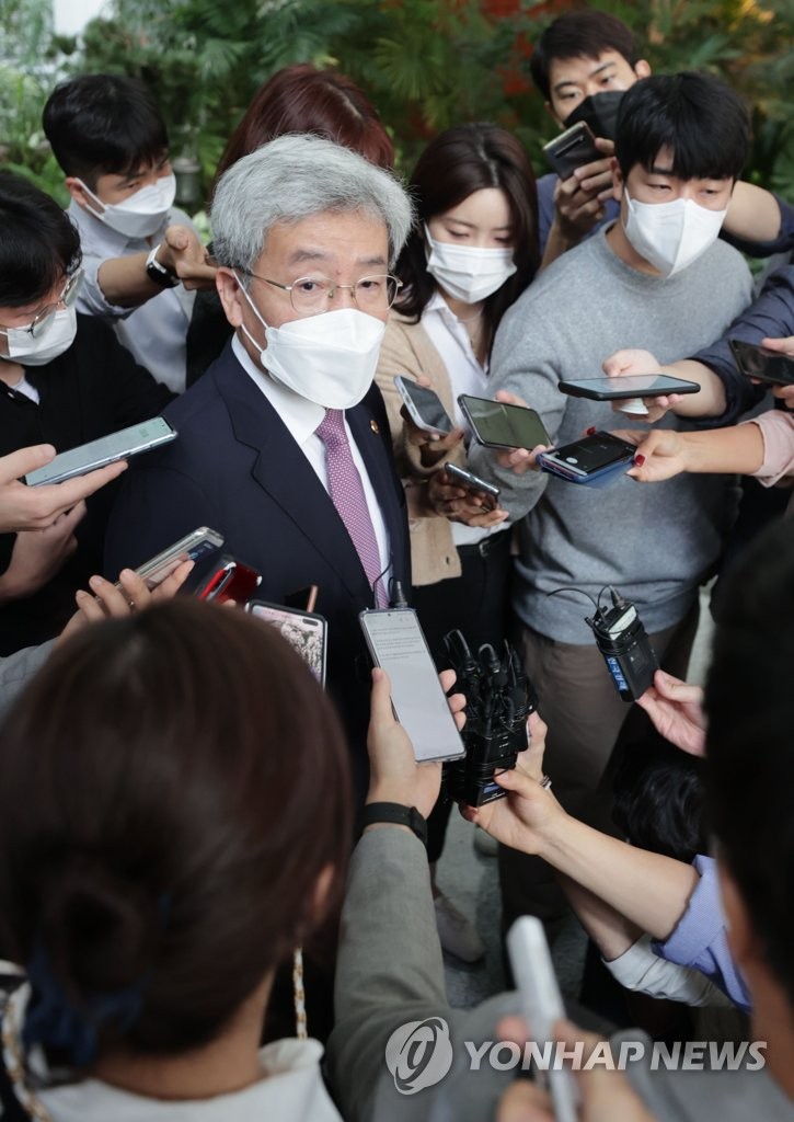 | ▲ Koh Seung-beom, head of the Financial Services Commission, speaks to reporters at the Korea Financial Investment Association in Seoul, in the Oct. 14, 2021, file photo, about financial authorities' decision to ease some restrictions on loans taken out for home rentals as part of efforts to protect people in actual need of borrowing money. (Yonhap) |