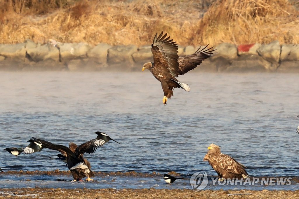 | ▲ 포항 형산강에 나타난 흰꼬리수리 (포항=연합뉴스) 손대성 기자 = 21일 경북 포항 형산강에서 천연기념물 243-4호인 흰꼬리수리 세 마리가 먹이 활동을 하고 있다. 2022.1.21 sds123@yna.co.kr |