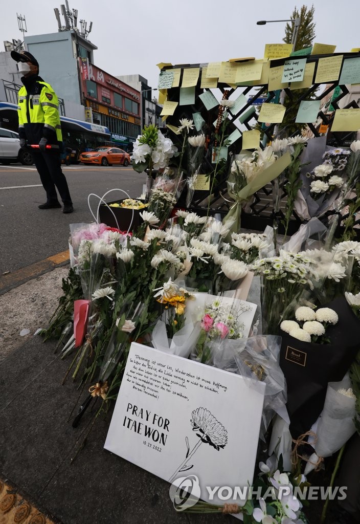 | ▲ Flowers and a message reading "Pray for Itaewon" are laid at a makeshift memorial near a downhill alley in Seoul's Itaewon district on Nov. 1, 2022, the site of a crowd crush on Oct. 29 that has left at least 155 people, mostly in their 20s, dead during Halloween festivities. (Yonhap) |