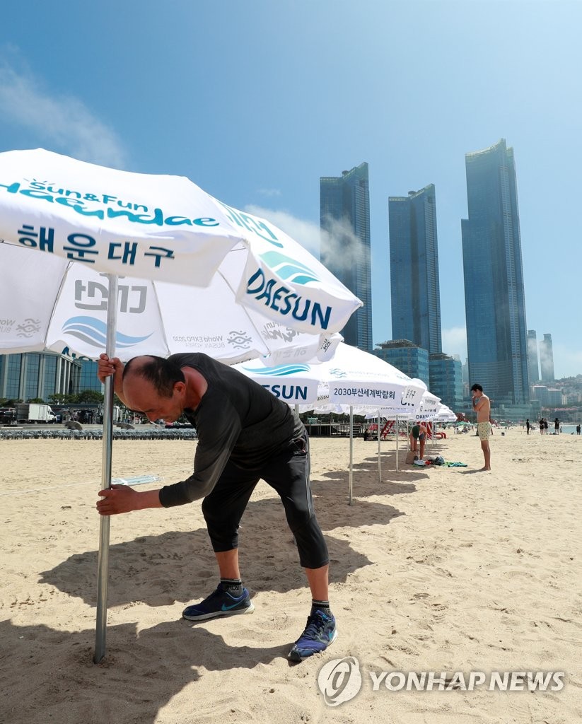 | ▲ 해수욕장 손님 맞이 (부산=연합뉴스) 손형주 기자 = 부산지역 해수욕장이 모두 개장한 1일 오전 부산 해운대해수욕장에 파라솔이 설치되고 있다. 2022.7.1 handbrother@yna.co.kr |