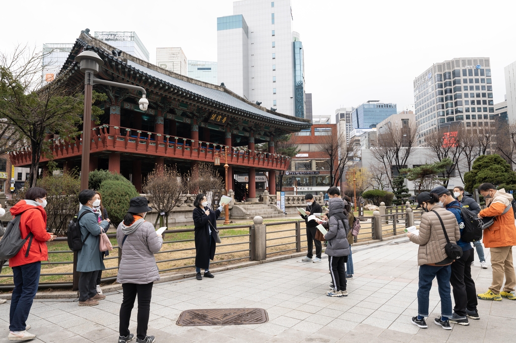 | ▲ 서울역사문화답사 모습. [서울역사편찬원 제공. 재판매 및 DB 금지] 지난달 26일 시민들이 보신각 앞에서 육의전과 시전상인에 대한 설명을 듣고 있다. |