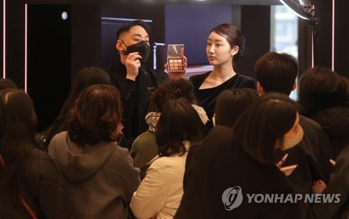 | ▲ People watch a makeup demonstration at a department store in Seoul on Feb. 1, 2023, after the government lifted an indoor mask mandate earlier in the week. (Yonhap) |