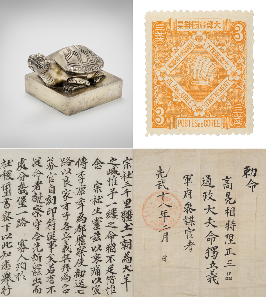 | ▲ 주요 전시품 왼쪽 위부터 시계방향으로 보물 '국새 대군주보', 고종황제 즉위 40주년 기념 우표, 고종의 칙령, 독립의군부 칙명. [문화재청 제공. 재판매 및 DB 금지] |