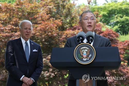 | ▲ Hyundai Motor Group Chairman Euisun Chung (R) makes a speech during his one-on-one meeting in Seoul with U.S. President Joe Biden, who was visiting South Korea for the summit with President Yoon Suk-yeol, in this file photo taken May 22, 2022. Chung unveiled a plan to build a US$5.5 billion plant in the U.S. state of Georgia to produce electric vehicles and EV batteries. (Yonhap) |