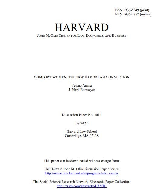 15일(현지시간) 하버드대 로스쿨 존 M. 올린 센터 홈페이지에 따르면 램지어 교수와 아리마 데쓰오 와세다대 교수가 쓴 '위안부 여성: 북한과의 관련성'이라는 제목의 논문이 8일 게시됐다.