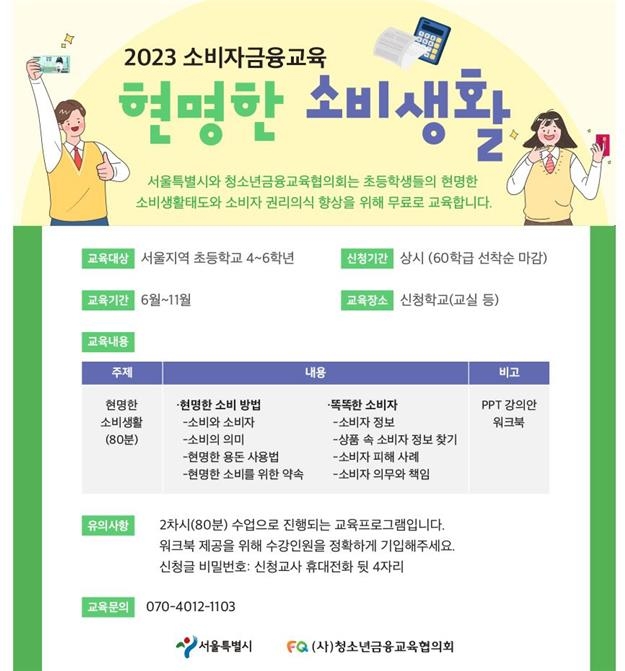 (서울=연합뉴스) 고은지 기자 = 서울시는 사단법인 청소년금융교육협의회와 올해 11월까지 서울 시내 초등학교 4∼6학년생을 대상으로 '소비자금융교육-현명한 소비생활'을 시행한다고 14일 밝혔다.
