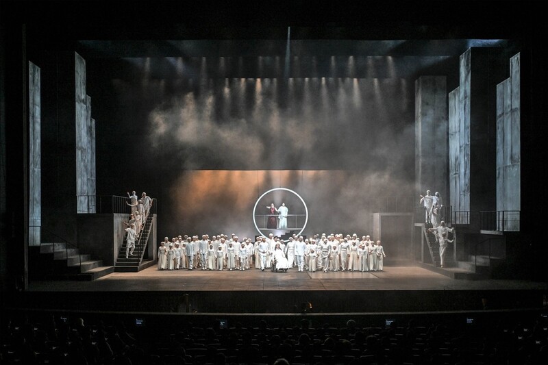 그런데도 무대가 열리고 흰옷을 입은 백성들이 무대로 쏟아져나오는 결말은 어두운색의 배경과 대비를 이루며 극적인 효과를 유발했다.