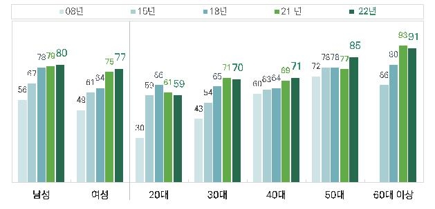 연령대별로 60대 이상은 91%, 50대 85%, 40대 71%, 30대 70%, 20대는 59%로, 40∼50대의 등산·숲길 체험인구 비율은 증가했지만 20대는 지속해서 줄고 있는 것으로 나타났다.
