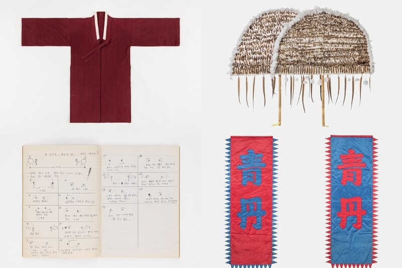 | ▲ 주요 전시품 왼쪽 위부터 시계 방향으로 지연광대의 옷, 주지판, 청단놀음기, 청단놀음 연습 노트 [국립민속박물관·예천청단놀음보존회 제공. 재판매 및 DB 금지] |