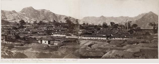 | ▲ 1890년 이전 서울 중구 정동 일대 전경 (서울=연합뉴스) 서쪽 인왕산에서 북쪽 북악산 자락까지 넓은 시각으로 정동 일대를 조망한 사진. 왼쪽 중앙에는 1885년부터 선교사들이 거처로 삼았던 미국 북장로회 선교기지가, 오른쪽 기와집들이 있는 구역에는 외국 공사관들이 자리 잡고 있다. 높은 깃대가 설치되어 있는 곳이 바로 미국공사관이다. 2023.1.26 [서울역사박물관 제공. 재판매 및 DB 금지] |