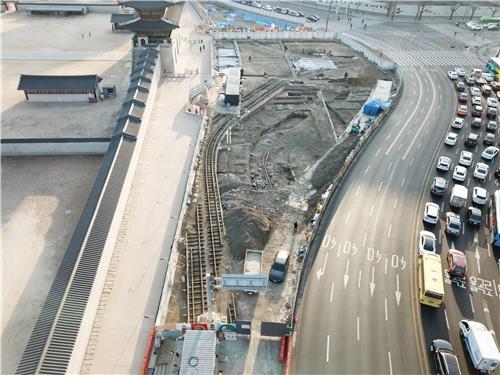 이번 발굴조사 현장에서는 일제강점기 때 설치한 전차 철로를 눈으로 직접 확인할 수 있다.
