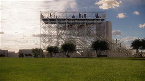 (서울=연합뉴스) 윤보람 기자 = 서울시는 9월 '2023 서울도시건축비엔날레' 개최에 앞서 행사장소인 종로구 열린송현녹지광장에 주 전시장이 될 전망대 형태의 조형물 '하늘소(所)'를 미리 만들어 다음 달 3일 공개한다고 13일 밝혔다.