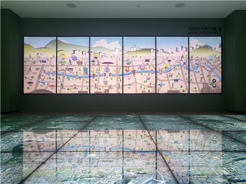 ▲ 서울역사박물관의 분관인 청계천박물관은 박물관과 관람객이 상호 소통할 수 있는 미디어 아카이브 월(Media Archive Wall)을 2층 상설전시실 마지막 부분인 4존에 설치한다. 6개 대형 터치 디스플레이에 펼쳐진 청계천 물길 일러스트를 중심으로, 주변에 배치된 움직이는 랜드마크를 터치하면 관련 이미지와 성세 설명 등을 볼 수 있다. 청계천 관련 자료와 전시, 조사·연구 결과물 등 1천여점이 탑재됐다. (서울=연합뉴스)