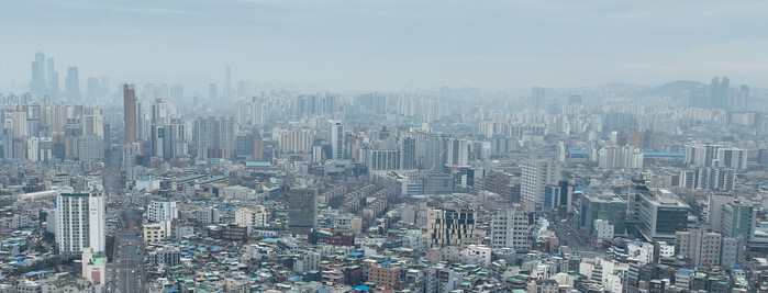 The sky over central Seoul, seen from the city's western Guro district, is clouded with fog and fine dust on March 2, 2025, as the fine dust level is classified as "bad." (Yonhap)