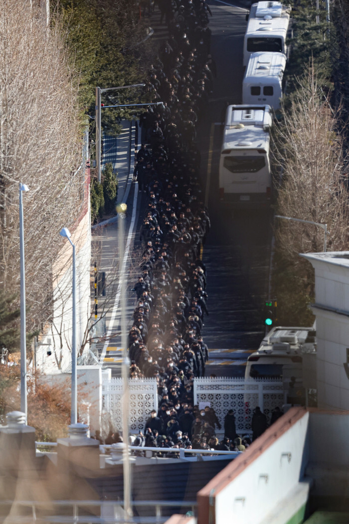 Investigators from the police exit the premises of impeached President Yoon Suk Yeol's official residence in Seoul on Jan. 15, 2025, after police and the anti-corruption agency executed a second warrant to detain Yoon in connection to his short-lived imposition of martial law. (Yonhap)