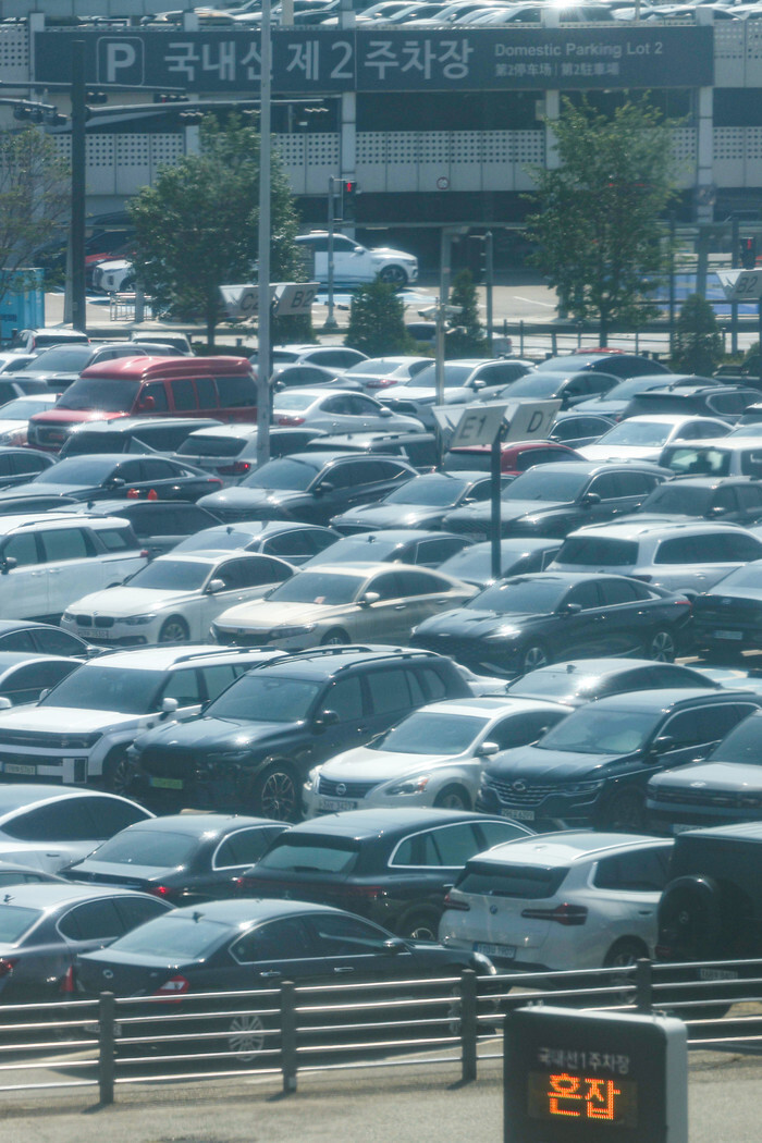 A parking lot at Gimpo airport in Seoul is filled on July 25, 2025, as domestic flights outbound from Seoul are expected to be extremely crowded the same day as the summer vacation season begins. (Yonhap)