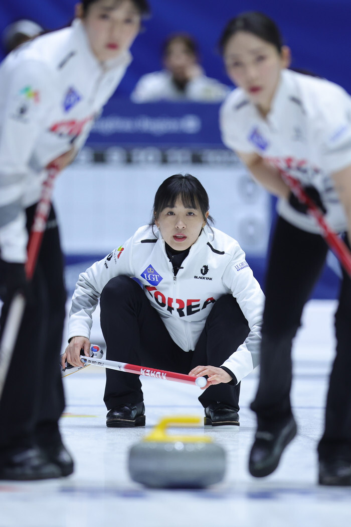 South Korean skip Gim Eun-ji (C) watches her shot during the team's round-robin match against Italy at the LGT World Women's Curling Championship at Uijeongbu Indoor Ice Rink in Uijeongbu, northeast of Seoul, on March 21, 2025. (Yonhap)