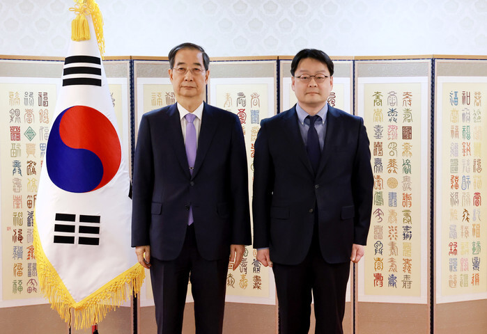 Acting President and Prime Minister Han Duck-soo (L) poses for a photo with new South Korean Ambassador to Denmark Rhee Dong-yeol after presenting him with a letter of credentials at the government complex in Seoul on April 29, 2025. (Yonhap)