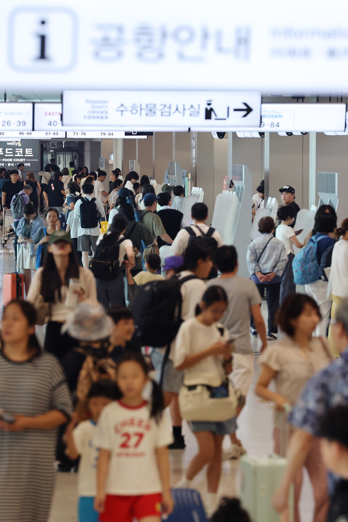 Holidaymakers pack the departure lobby of Gimpo airport in Seoul on July 25, 2025, as domestic flights outbound from Seoul are expected to be extremely crowded the same day as the summer vacation season begins. (Yonhap)