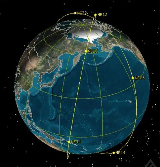 This photo, provided by the science ministry, shows a rendering of a satellite constellation, which South Korea plans to establish with its homegrown nanosatellites by 2027. To that end, named the "Beginning Of The Swarm," the country's first homegrown Earth observation nanosatellite NEONSAT-1 was successfully launched aboard a lightweight Electron orbital rocket of Rocket Lab, a U.S. aerospace manufacturer and launch service provider, in Mahia, New Zealand, at 7:32 a.m. on April 24, 2024. (PHOTO NOT FOR SALE) (Yonhap)