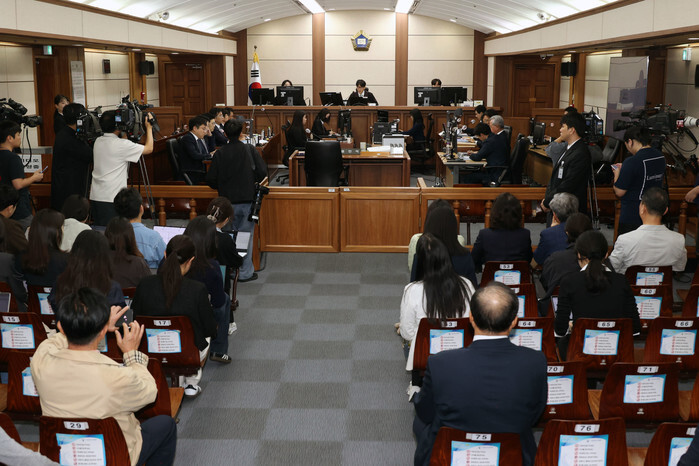 Presiding judge Ryu Kyung-jin (C, rear) is seated at a courtroom of the Seoul Central District Court in the capital on Oct. 17, 2025, to attend former Interior and Safety Minister Lee Sang-min's first hearing of his trial on charges of playing a key role in former President Yoon Suk Yeol's failed attempt to impose martial law. (Pool photo) (Yonhap)