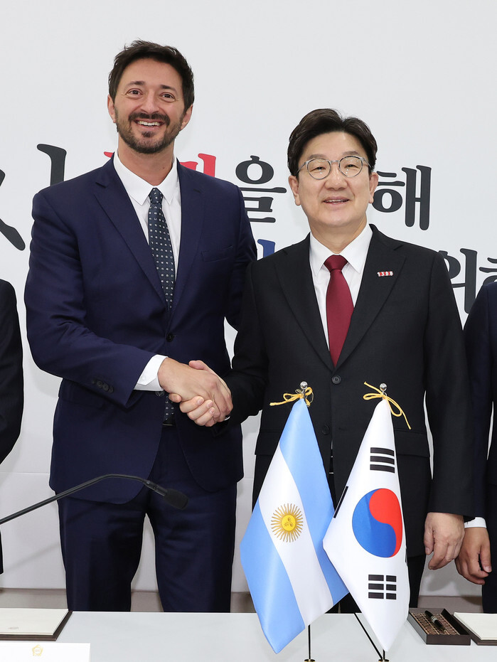 Kweon Seong-dong (R), floor leader of the conservative People Power Party, and Argentina's lower house lawmaker Martin Yeza pose for a photo during their meeting at the National Assembly in Seoul on April 25, 2025. (Yonhap)