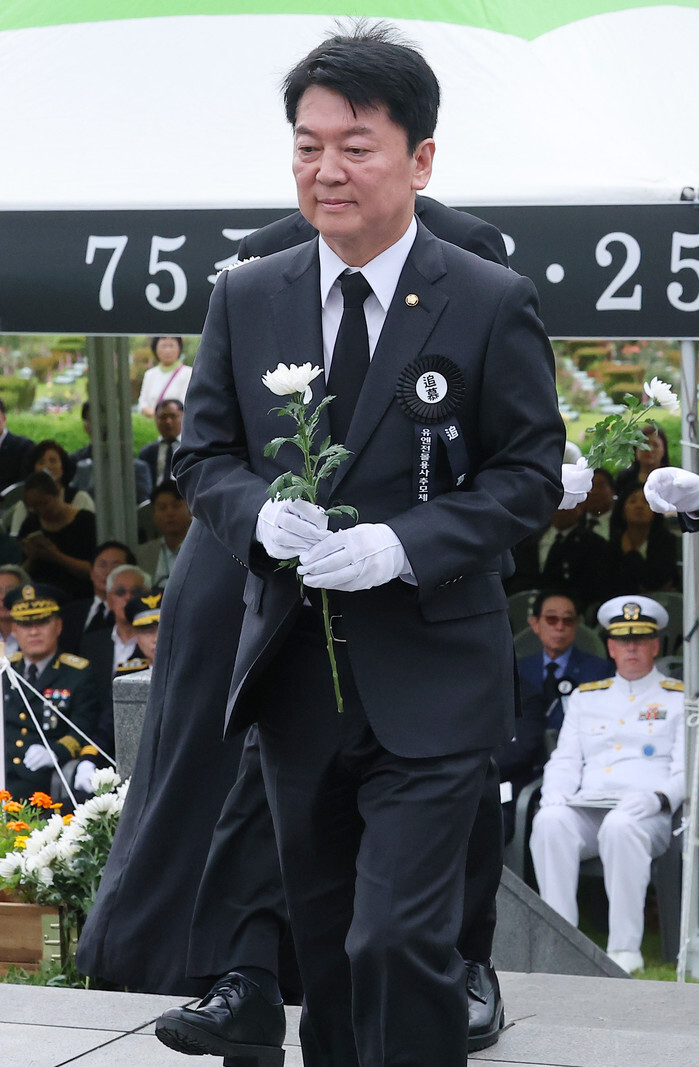 Ahn Cheol-soo, a lawmaker of the People Power Party, offers a flower during a memorial ceremony at the U.N. Memorial Park in the southeastern port city of Busan on June 25, 2025, to pay tribute to fallen Allied soldiers as part of events to commemorate the 75th anniversary of the outbreak of the 1950-53 Korean War. The memorial park is for soldiers from the United States and 15 other nations who were killed in action while fighting for South Korea against invading North Korea under the U.N. flag during the three-year conflict. (Yonhap)
