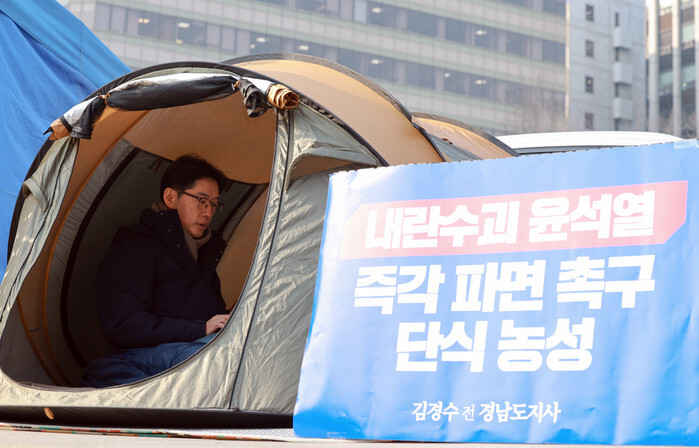 Former South Gyeongsang Gov. Kim Kyoung-soo, affiliated with the main opposition Democratic Party, stages a hunger strike in Seoul on March 10, 2025, to call for impeached President Yoon Suk Yeol's removal from office. (Yonhap)