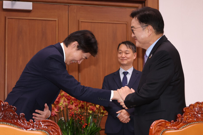 Cho Kuk (L), new leader of the minor Rebuilding Korea Party, shakes hands with National Assembly Speaker Woo Won-shik at the latter's office in Seoul on Nov. 25, 2025. (Yonhap)