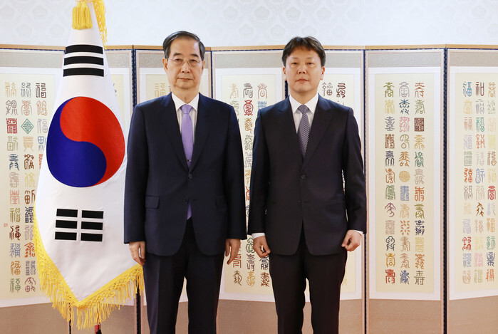 Acting President and Prime Minister Han Duck-soo (L) poses for a photo with new South Korean Ambassador to Lebanon Geon Gyu-suk after presenting him with a letter of credentials at the government complex in Seoul on April 29, 2025. (Yonhap)