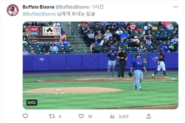 | ▲ 삼진 잡은 류현진 토론토 블루제이스 산하 버펄로 바이슨스 유니폼을 입은 류현진이 22일(한국시간) 미국 뉴욕주 시러큐스 NBT뱅크 스타디움에서 열린 미국프로야구 마이너리그 트리플A 시러큐스 메츠(뉴욕 메츠 산하)와 방문 경기에서 삼진을 잡은 뒤 호흡을 다듬고 있다. [버펄로 바이슨스 트위터 계정 캡처. 재배포 및 DB 금지] |