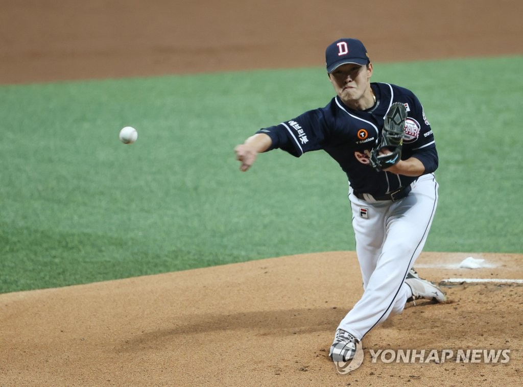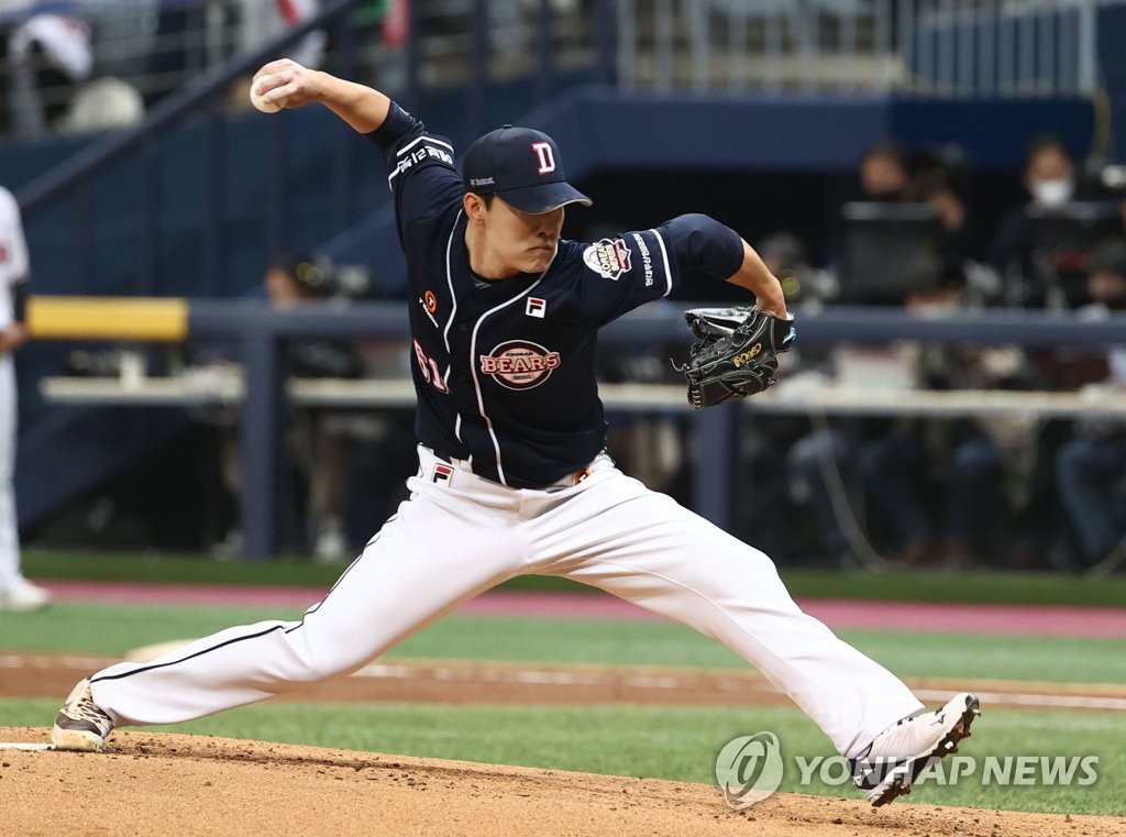 | ▲  In this file photo from Nov. 15, 2021, Choi Won-joon of the Doosan Bears pitches against the KT Wiz in the bottom of the first inning of Game 2 of the Korean Series at Gocheok Sky Dome in Seoul. (Yonhap) |