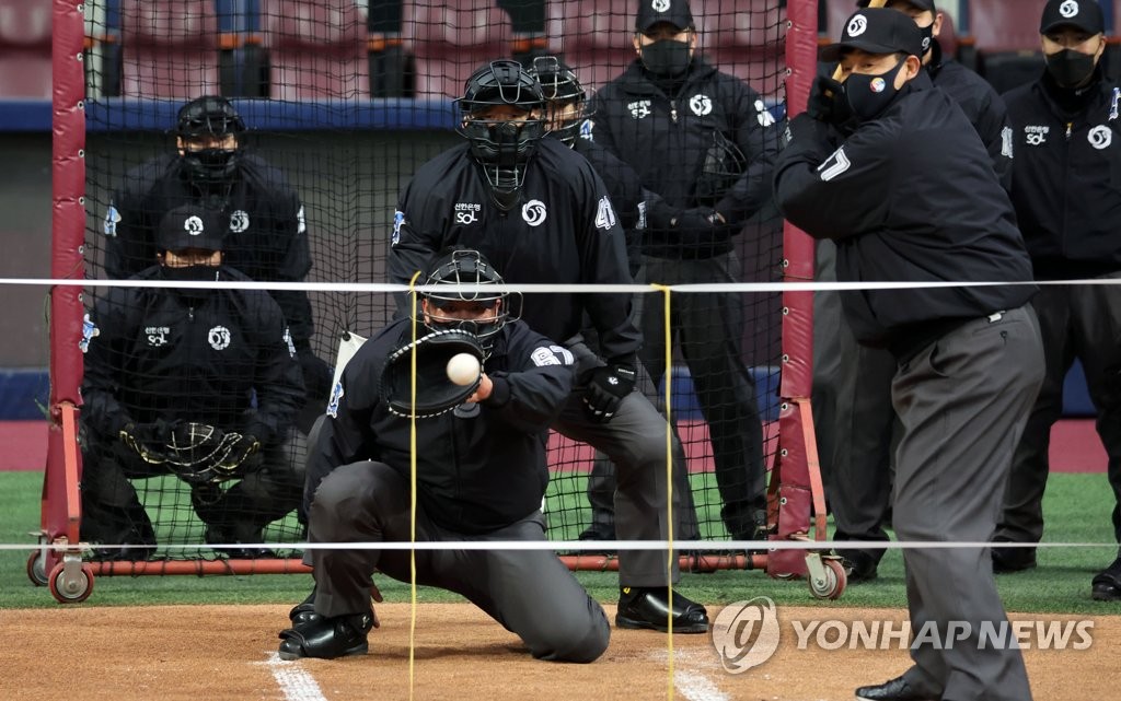 | ▲  Korea Baesball Organization umpires work on an expanded strike zone with the aid of a pitching machine at Gocheok Sky Dome in Seoul on Jan. 11, 2022. (Yonhap) |