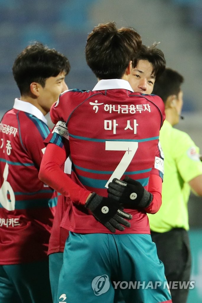 ▲ Masatoshi Ishida of Daejeon Hana Citizen (front) congratulates teammate Lee Hyun-sik on Lee's goal against Gangwon FC during the first leg of the K League promotion-relegation playoffs at Hanbat Stadium in Daejeon, some 160 kilometers south of Seoul, on Dec. 8, 2021. (Yonhap)