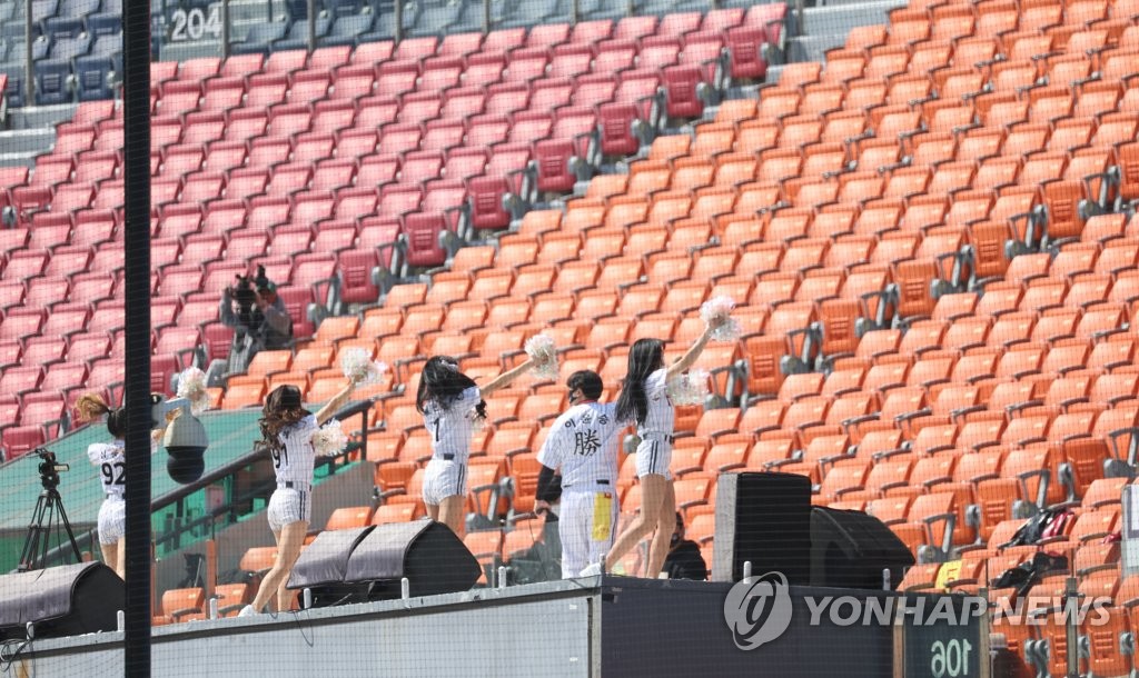 | ▲ Cheerleaders for the LG Twins perform on the stage at Jamsil Baseball Stadium in Seoul during a Korea Baseball Organization preseason game between the Twins and the Lotte Giants on March 27, 2022. (Yonhap) |