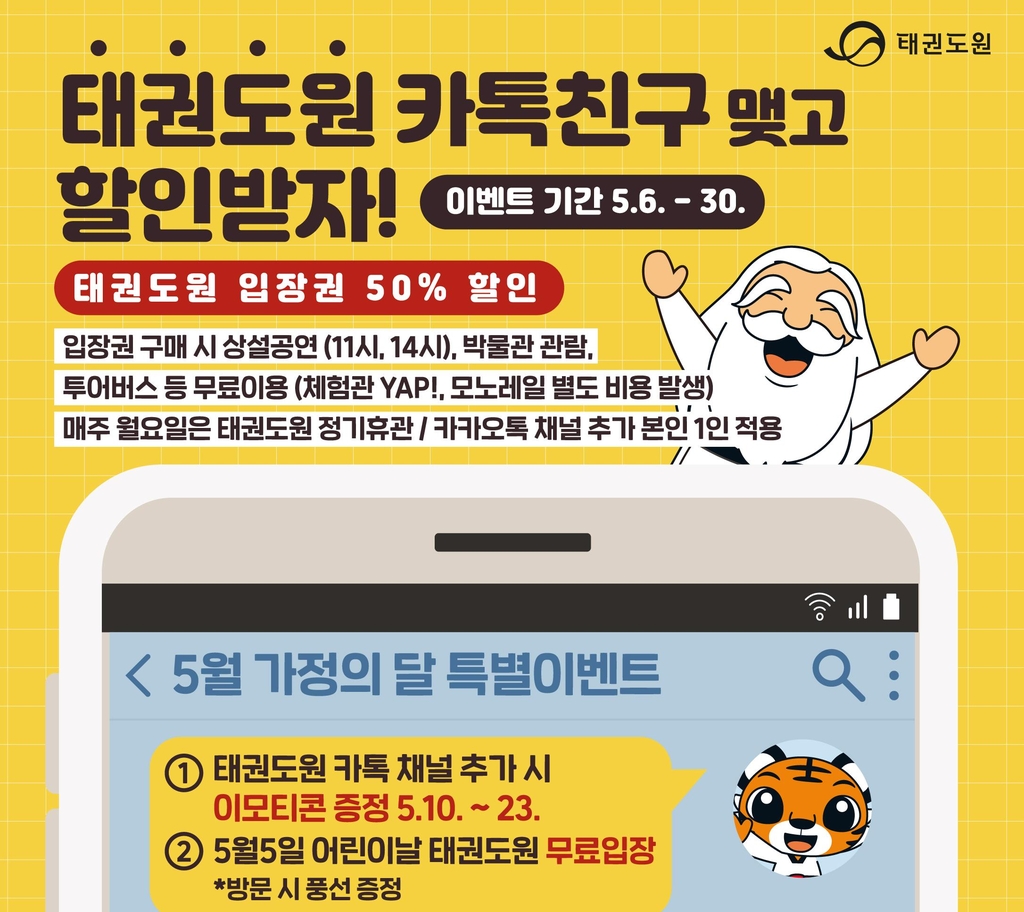이벤트는 어린이날 당일 '태권도원 무료입장', 카카오톡 채널 추가 시 태권도원 입장권 50% 할인 및 이모티콘 선물, 테권 격파 왕 이벤트, 국립태권도박물관 해설 프로그램 등이다.