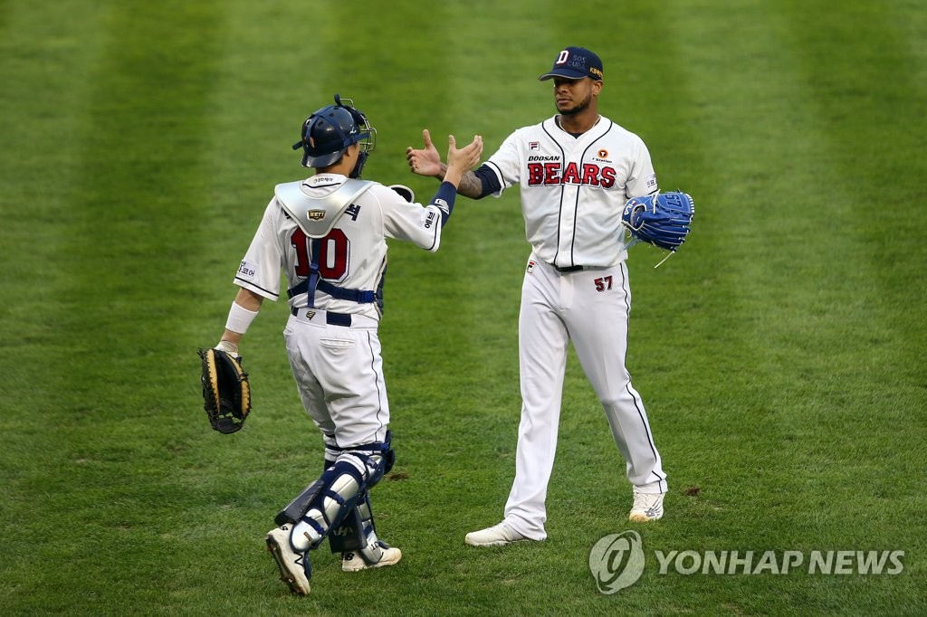 | ▲  Ariel Miranda of the Doosan Bears (R) is congratulated by his catcher Park Sei-hyok after throwing a complete game shutout against the Kia Tigers in a Korea Baseball Organization regular season game at Jamsil Baseball Stadium in Seoul on Sept. 1, 2021, in this photo provided by the Bears. (PHOTO NOT FOR SALE) (Yonhap) |