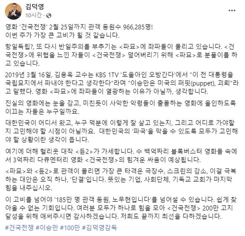 또 "이 고비를 넘어야 185만명 관객을 동원한 '노무현입니다'를 넘어설 수 있다"며 "'건국전쟁'의 200만 고지 달성을 위해 애써달라"고 덧붙였다.