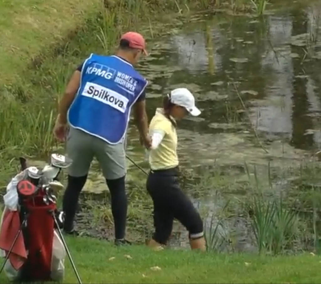 스필코바는 결국 신발과 양말을 벗고, 바지까지 걷어 올린 뒤 물속에 발을 담근 채 두 번째 샷을 했고, 이 공이 홀 약 1m 정도에 놓이면서 극적으로 파를 지켰다.
