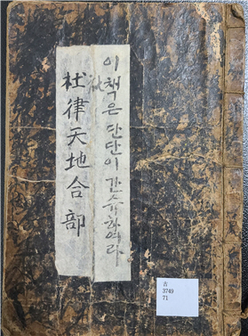 기증 자료 중에는 '이 책은 단단히 간수하여라'는 글이 적힌 '두율천지합부'(杜律天地合部)도 있다.