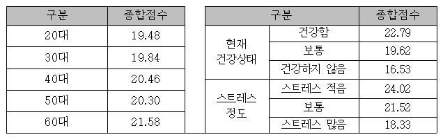 건강 상태가 좋은 집단의 점수는 22.79점으로, 건강하지 않은 집단(16.53점)보다 6.26점 높았다.