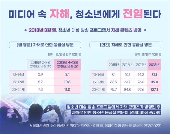 연구팀은 한 유료방송채널 오디션 프로그램에서 자해 관련 내용이 방송된 2018년 3월말 전후의 아동·청소년 자해 시도 건수를 비교했다. 분석에는 2015년~2018년 응급실을 방문한 자 중 자해로 인한 환자 11만5천647명의 데이터가 사용됐다.