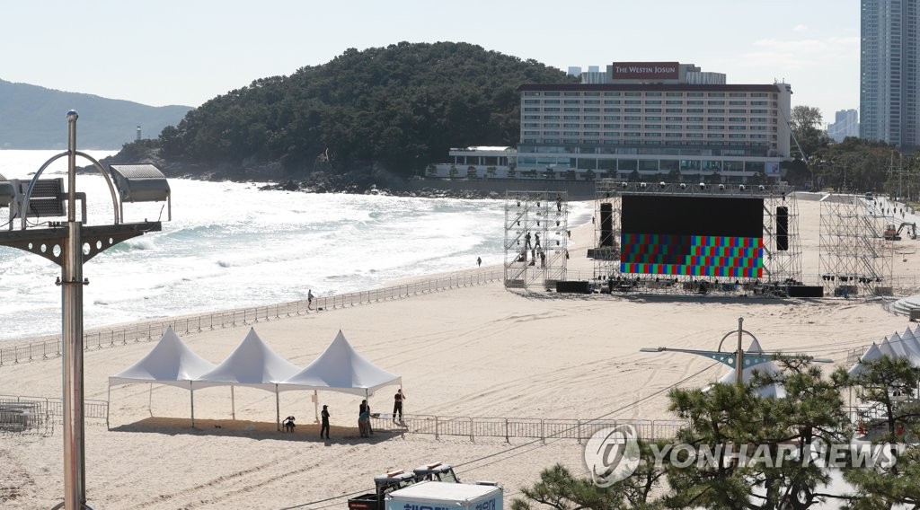 | ▲ BTS 부산 콘서트 생중계되는 해운대 (부산=연합뉴스) 손형주 기자 = 13일 오후 부산 해운대해수욕장에 2030세계박람회 유치기원 BTS 부산 콘서트 중계를 위한 스크린이 설치되고 있다. 해운대해수욕장 백사장 특설무대에서 BTS 부산콘서트가 열리는 15일 오후 콘서트 영상이 라이브로 중계된다. 2022.10.13 handbrother@yna.co.kr |