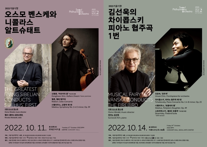 서울시립교향악단은 11일 서울 송파구 롯데콘서트홀에서 '오스모 벤스케와 니콜라스 알트슈태트'를, 14일에는 서초구 예술의전당 콘서트홀에서 '김선욱의 차이콥스키 피아노 협주곡 1번'을 각각 공연한다고 6일 밝혔다.