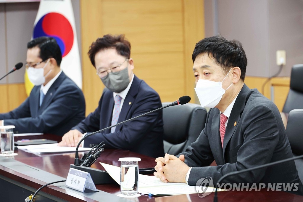 | ▲ Kim Joo-hyeon (R), head of the Financial Services Commission (FSC), speaks during a meeting with the heads of policy financing organizations, including the Export-Import Bank of Korea, at the government complex in Seoul, in this file photo taken Aug. 2, 2022. (Yonhap) |