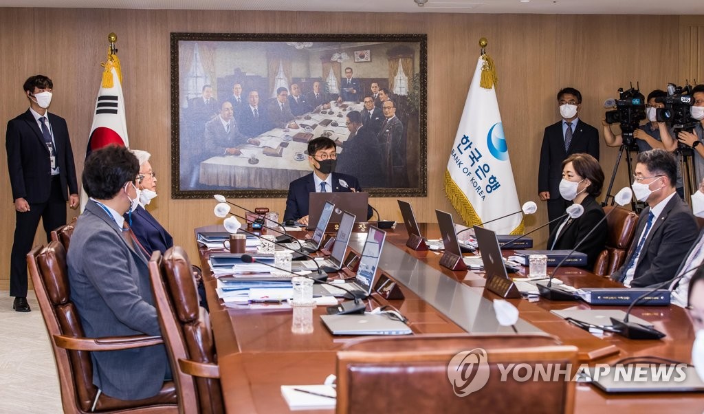 | ▲ Bank of Korea Gov. Rhee Chang-yong (C) presides over a Monetary Policy Committee meeting at the central bank in Seoul, in this file photo taken Aug. 25, 2022. The central bank raised its key rate by a quarter percentage point to 2.5 percent to suppress inflation expected to hit the highest level in more than two decades this year. (Pool photo) (Yonhap) |