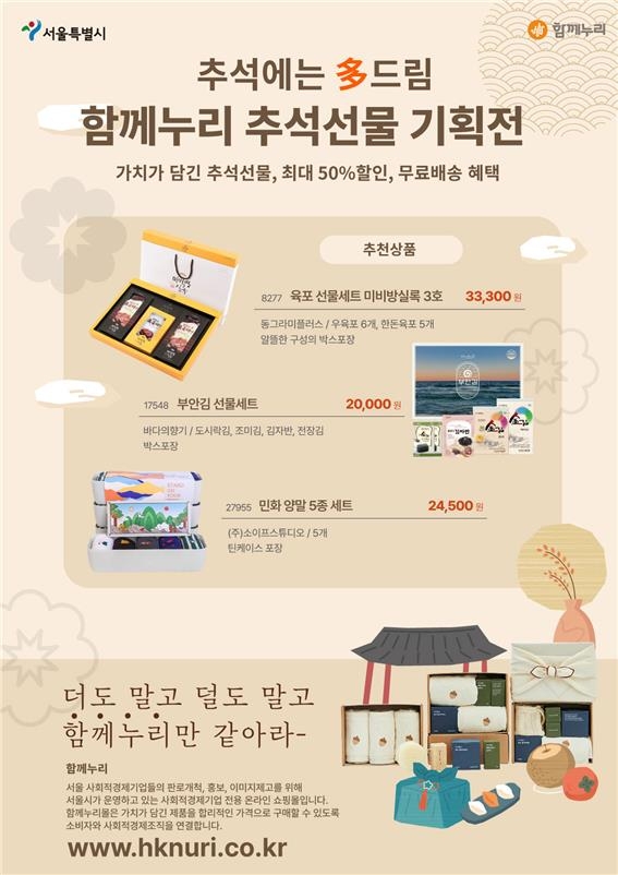 (서울=연합뉴스) 고은지 기자 = 서울시는 추석을 맞이해 9월 한 달간 시가 직접 운영하는 가치소비 온라인쇼핑몰 '함께누리'(https://www.hknuri.co.kr/)에서 할인 기획전을 연다고 18일 밝혔다.