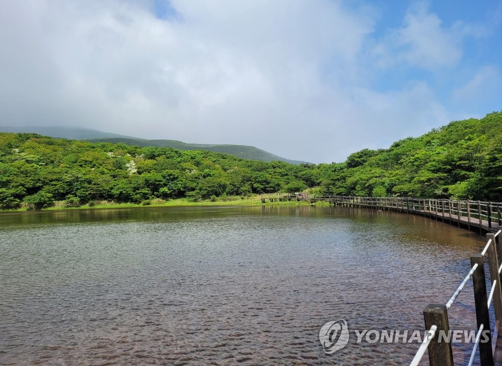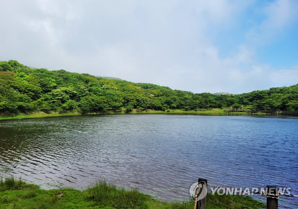 (제주=연합뉴스) 28일 제주 한라산 성판악 탐방로 남쪽에 자리한 사라오름 분화구에 물이 가득 차 탐방객 눈길을 사로잡고 있다.