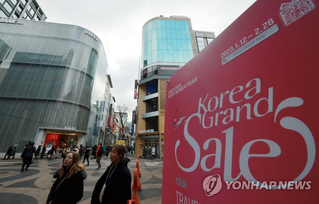 | ▲ People walk past a sign promoting the Korea Sales Festa, one of the largest shopping events in South Korea, in the tourist district of Myeongdong, central Seoul, on Jan. 31, 2023. (Yonhap) |