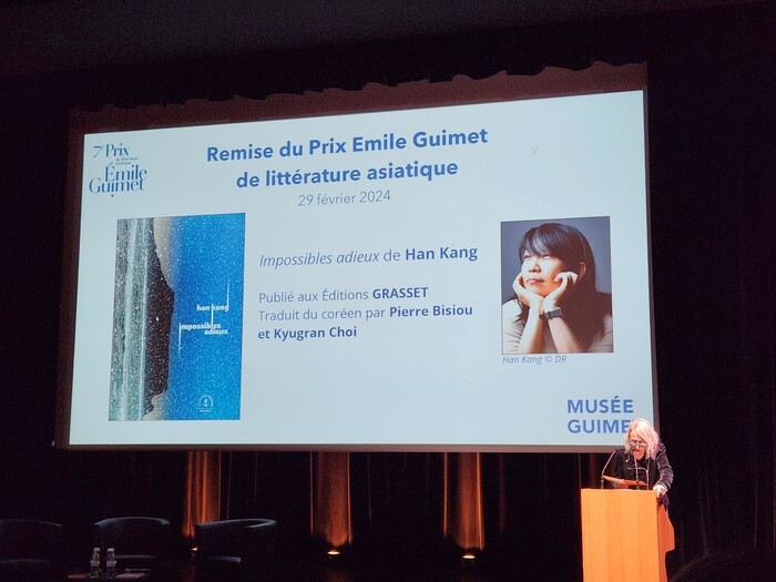 This photo shows a ceremony where South Korean author Han Kang's "I Do Not Bid Farewell" was chosen as the winner of the seventh edition of the Emile Guimet Prize for Asian Literature in France on Feb. 29, 2024. (Yonhap)